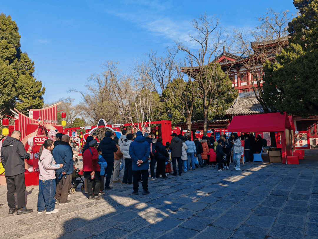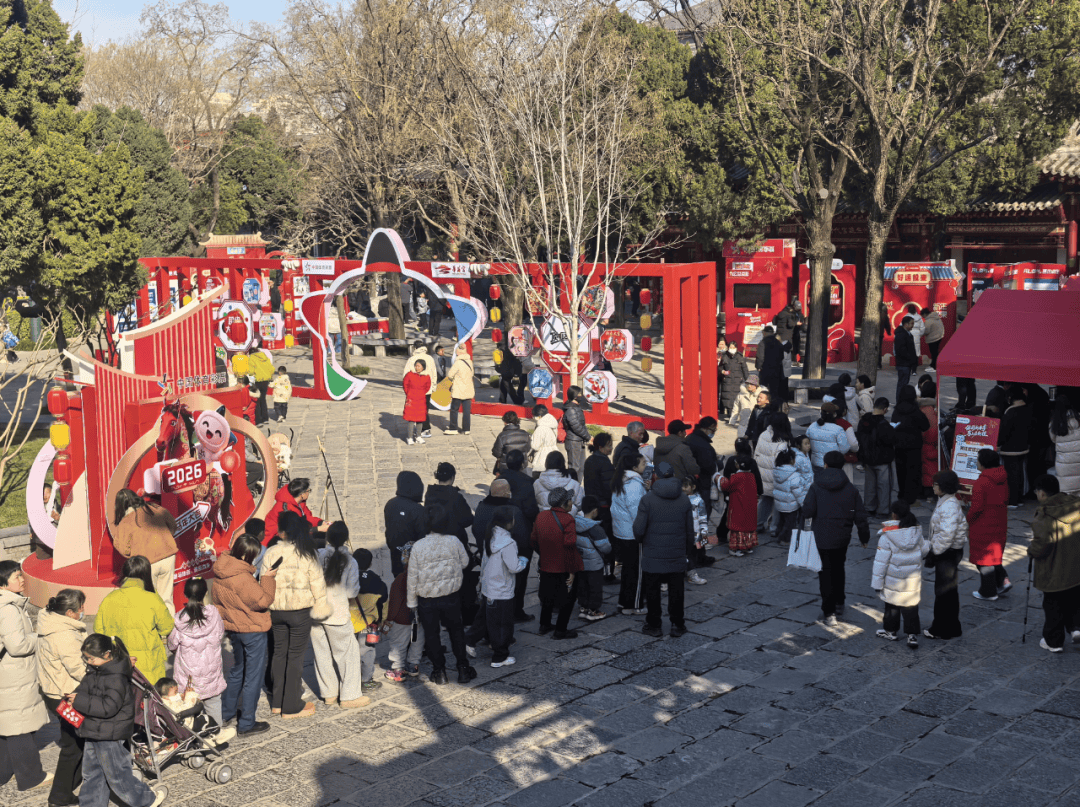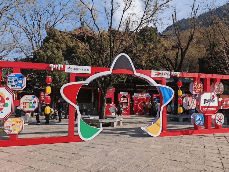 活动现场洋溢着浓郁的新年气息,“体彩新春季马上启新程”标语醒目亮眼,精心搭建的体彩新春市集以红灯笼、新春对联、特色节饰点缀,与华清宫的文化建筑相映成趣。游客聚集在中式古建筑修文堂前,景区内色彩鲜艳的装饰与热闹的游客景象,营造出独具一格的节日氛围。
