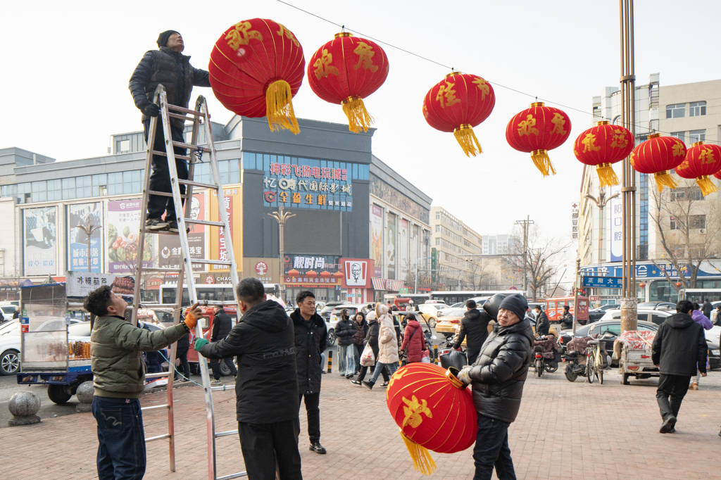 2026年2月14日,黑龙江肇东县,百货大楼前的人们挂起灯笼。本文均为 赵智 图