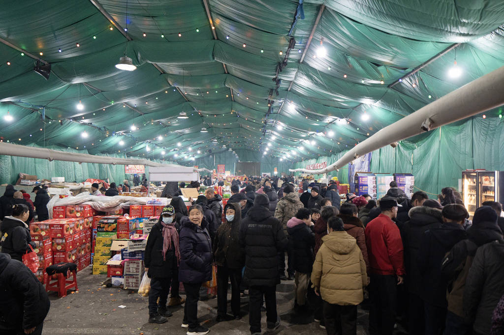 2026年2月14日,摆摊的人和大灯笼,招引顾客上前采购,吉林省公主岭市怀德大剧院农贸市场。